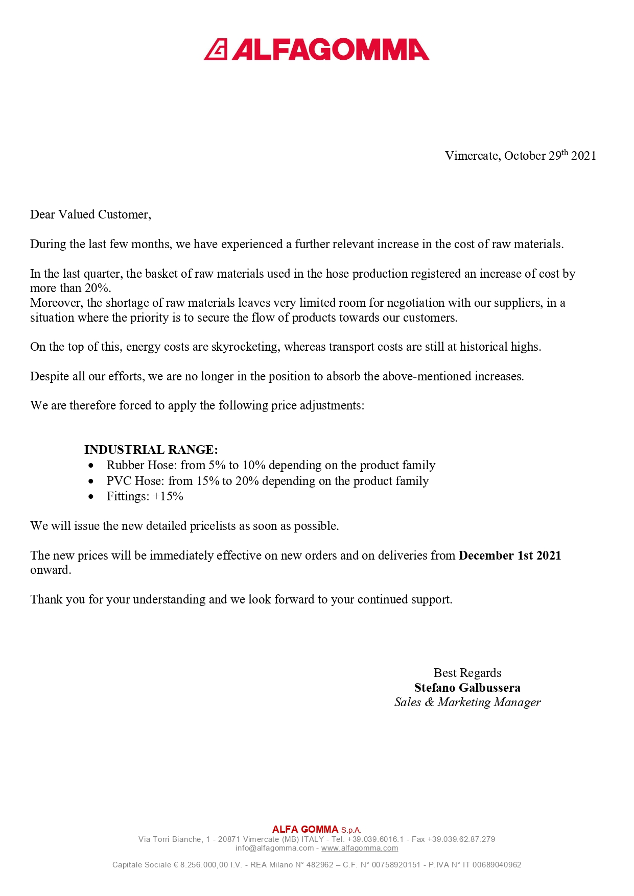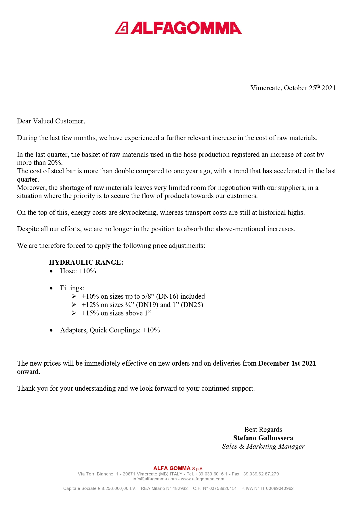 Уважаемые клиенты и партнеры! Обратите внимание, с 1 декабря 2021 года Alfagomma повышает цены на РВД и комплектующие. Успейте приобрети по старым ценам!